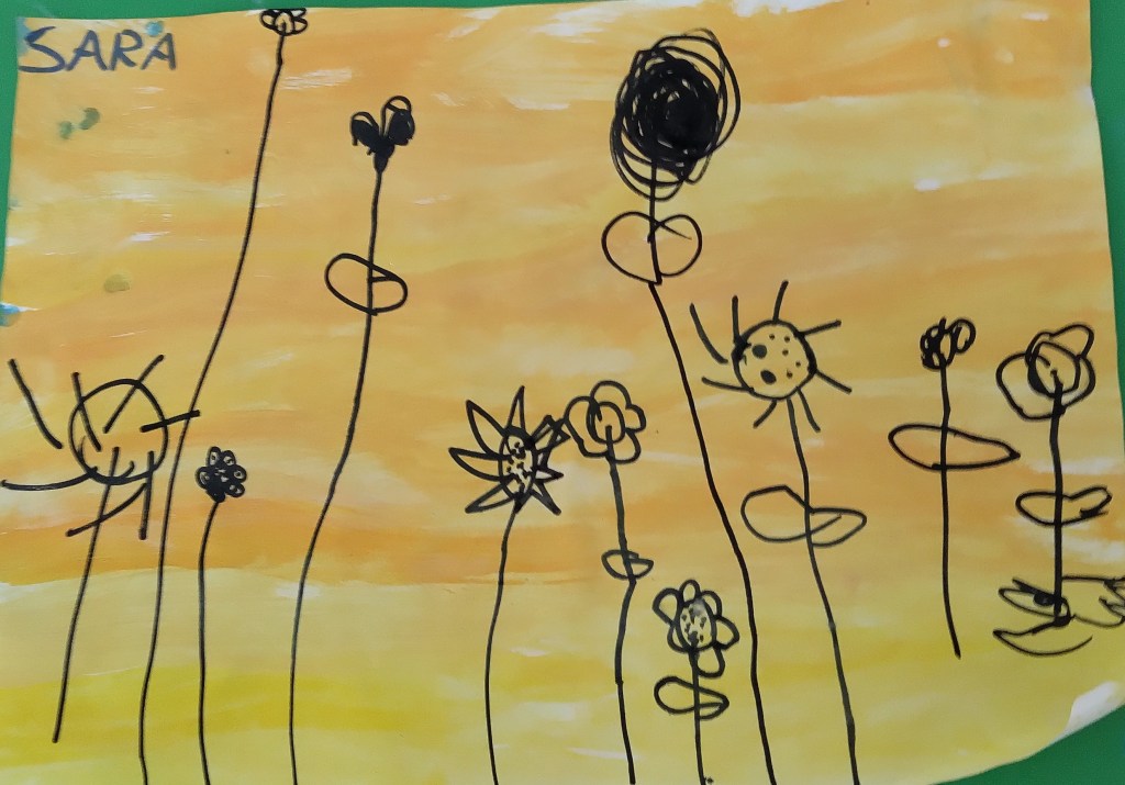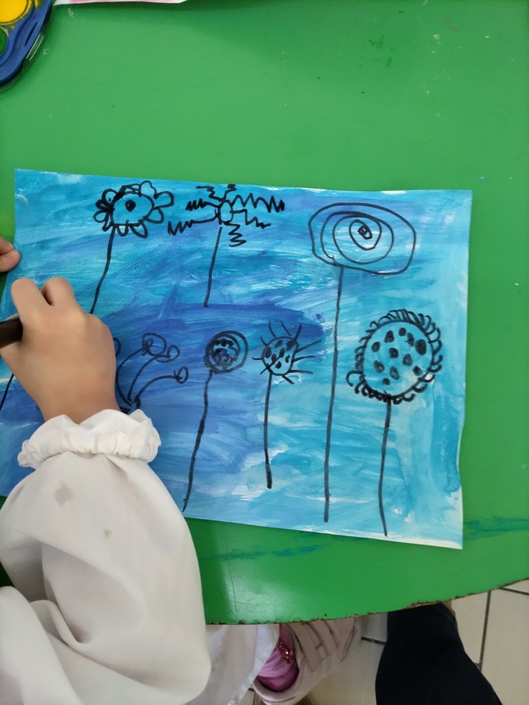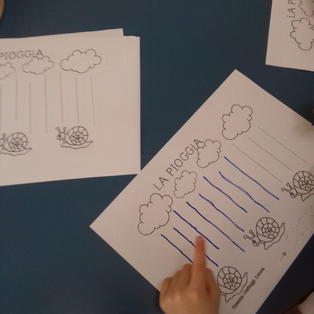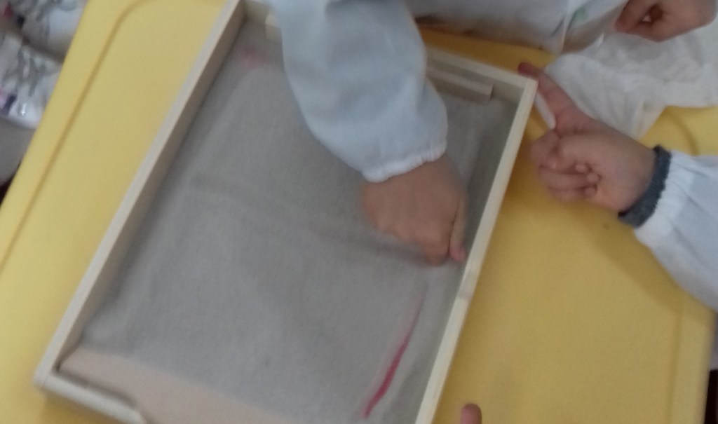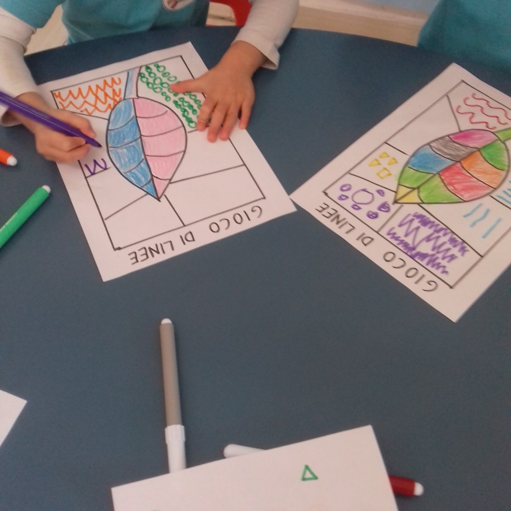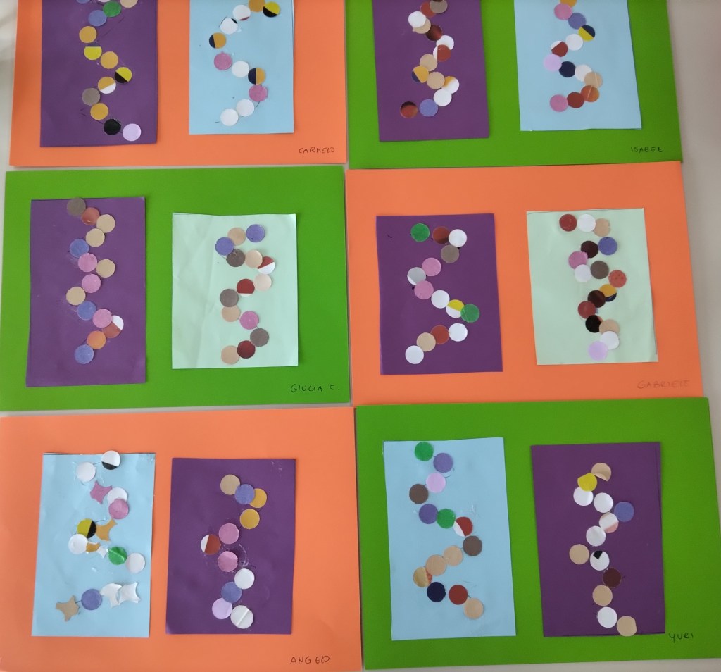 Per tale motivo con la mia collega abbiamo deciso di cominciare insieme il percorso dalle linee, solo in un secondo momento lei si dedicherà all’ambito logico-matematico ed io a a quello propriamente linguistico ( le foto di seguito riportate si riferiscono a questo ambito). In tale percorso si parte dall’esperienza corporea per poi passare a quella manipolatoria ed infine alla rielaborazione grafica.