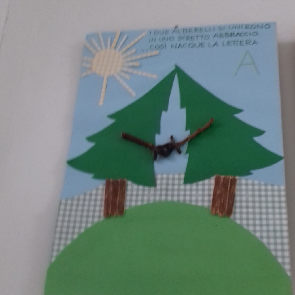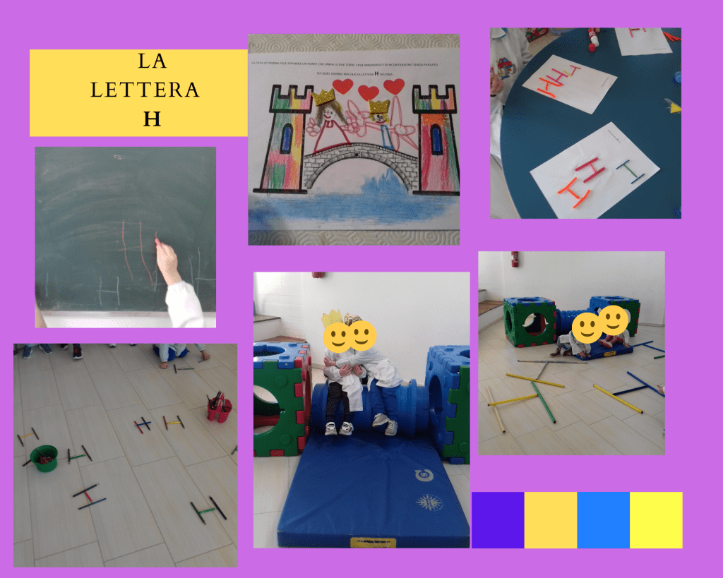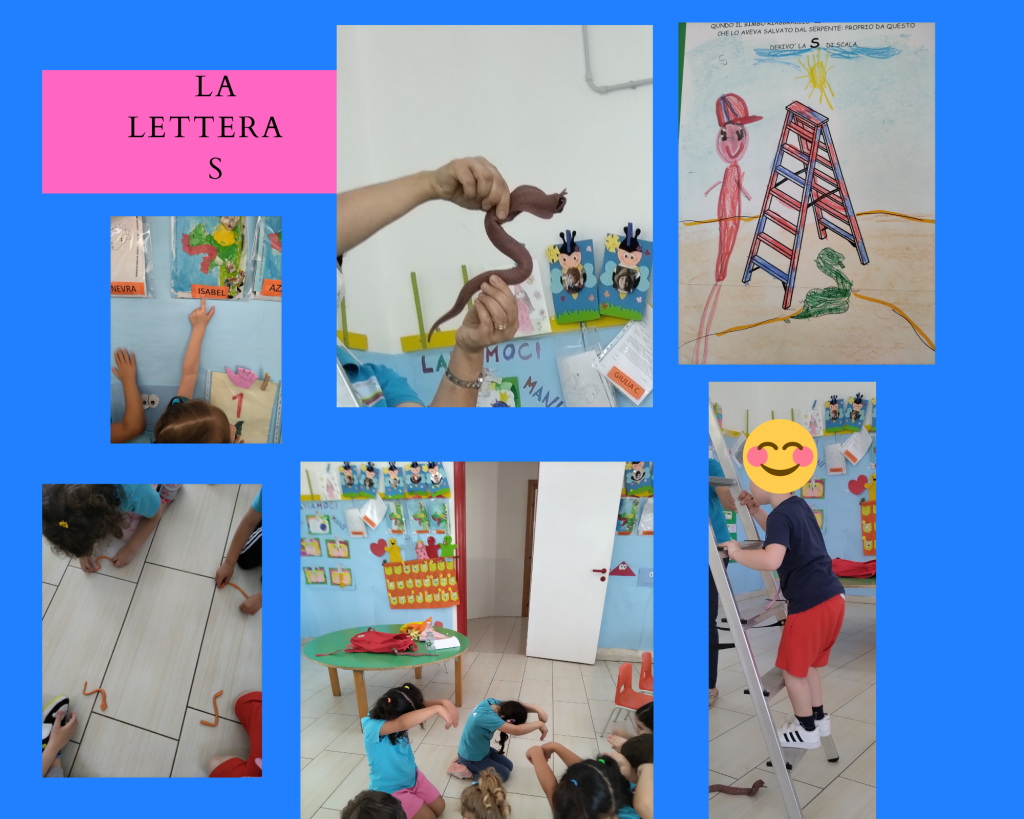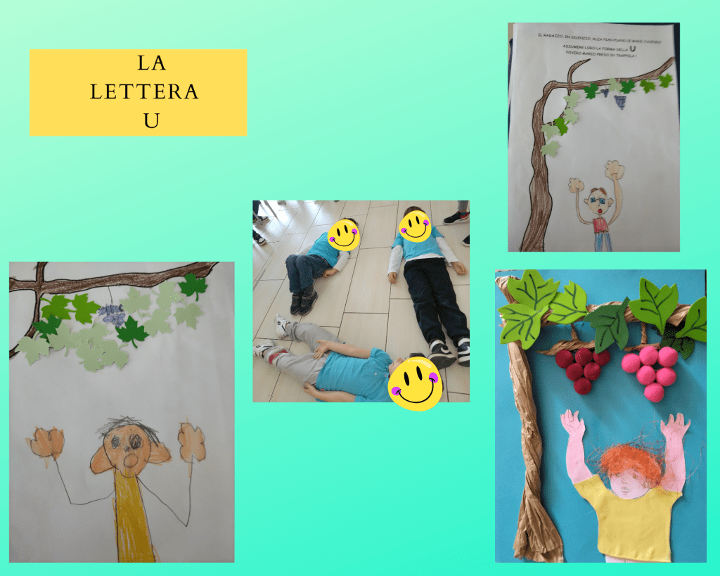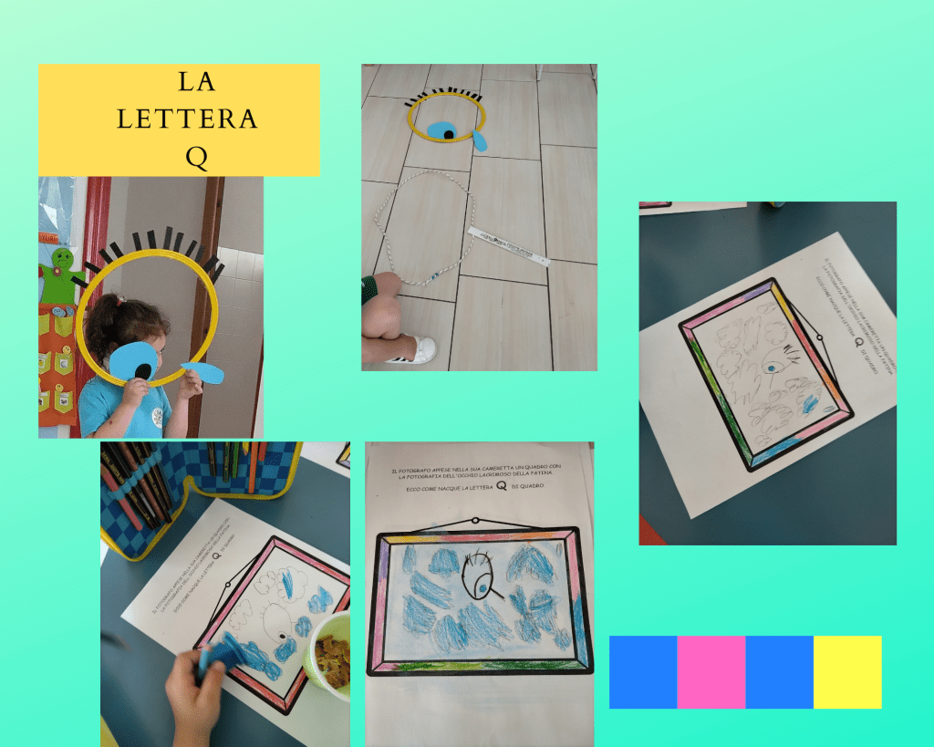 (Di seguito sono riportate le foto dei cartelli che rappresentano le “lettere raccontate” realizzate da una mia collega e gentilmente prestate alla mia sezione e anche le foto che rappresentano tutte le attività svolte per ogni lettera)