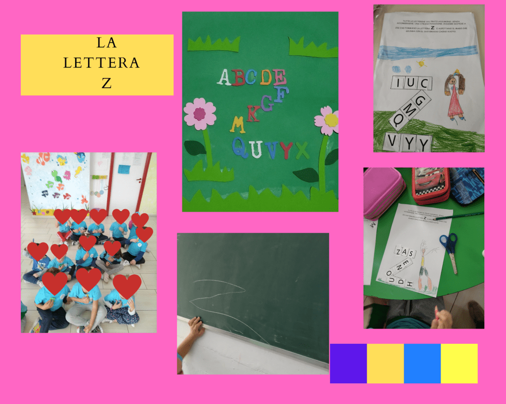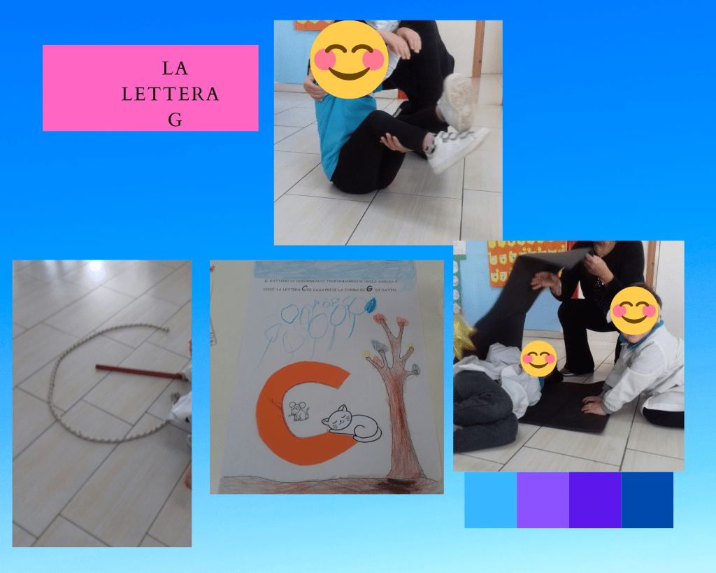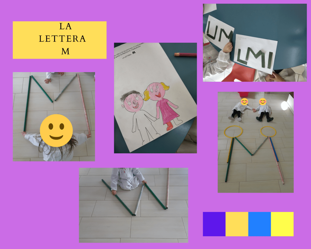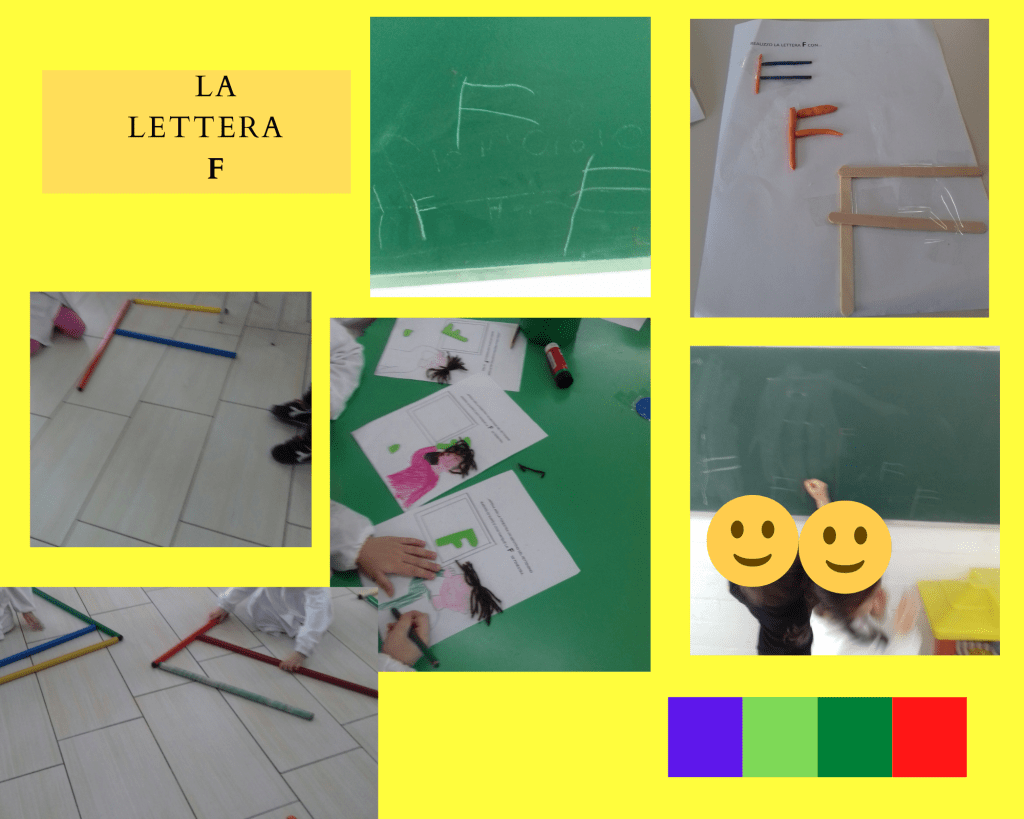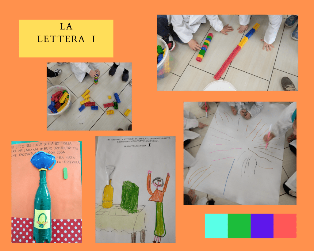 (Di seguito sono riportate le foto dei cartelli che rappresentano le “lettere raccontate” realizzate da una mia collega e gentilmente prestate alla mia sezione e anche le foto che rappresentano tutte le attività svolte per ogni lettera)
