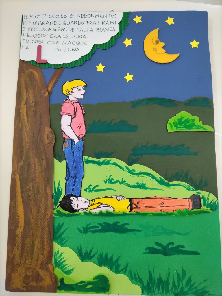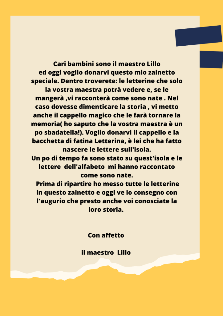 Dopo aver raccontato le storie inerenti alla nascita di ogni lettera, alcuni bambini mi hanno chiesto di” pescare “le letterine straniere. A questo punto è sorto un problema: nei “racconti delle lettere” queste storie non sono presenti! Allora mi sono inventata che, essendo straniere , parlavano in inglese e il maestro Lillo non ha capito cosa cosa dicevano( e una volta consegnato a me lo zaino nemmeno io ho capito cosa raccontavano!) Fatina letterina le ha presentate comunque al maestro dicendo il loro nome. Così il maestro le ha messe nello zaino insieme alle altre ed ha lasciato l’isola a bordo di una barca…
