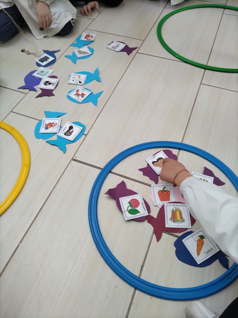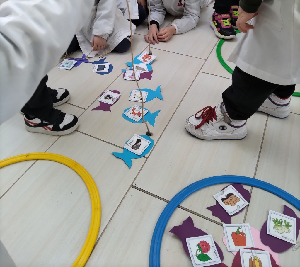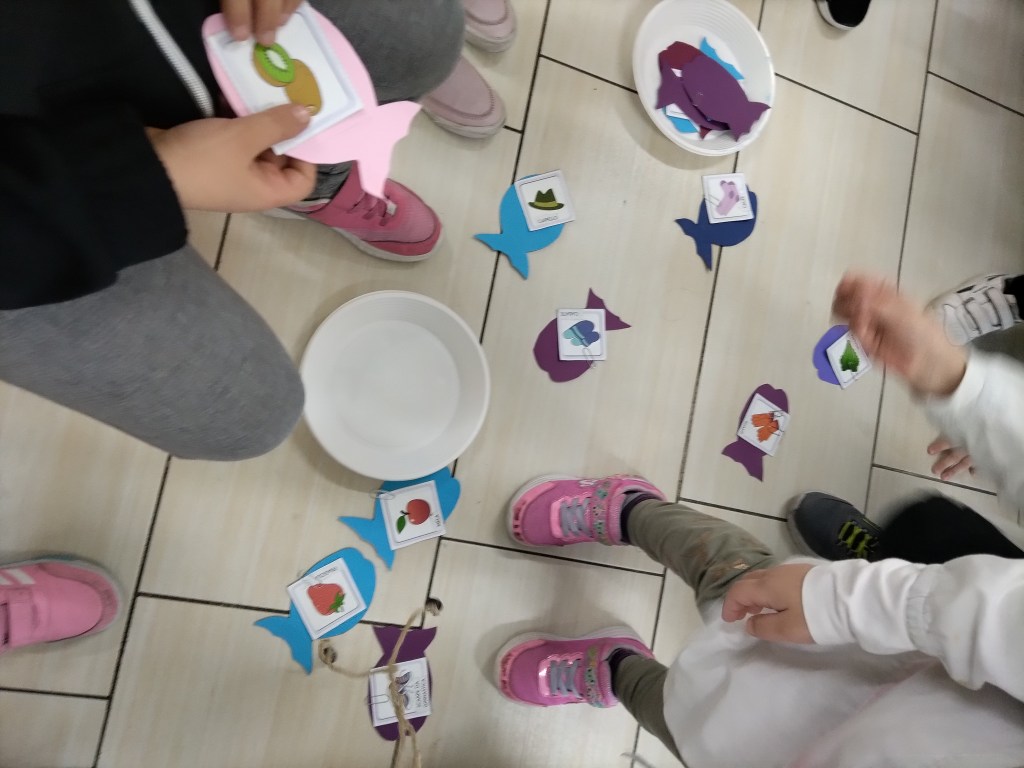 Ho preparato dei pesciolini di cartoncino su cui ho attaccato con una graffetta delle immagini riferite a varie categorie di parole : cibo, abbigliamento, animali, elettrodomestici, veicoli…I bambini con delle canne da pesca con calamita devono pescare la categoria di vocaboli indicata da me di volta in volta e poi mettere i pesci pescati insieme nello stesso cestino ( io ho usato un cerchio, un piatto, ma si può usare un qualsiasi contenitore).