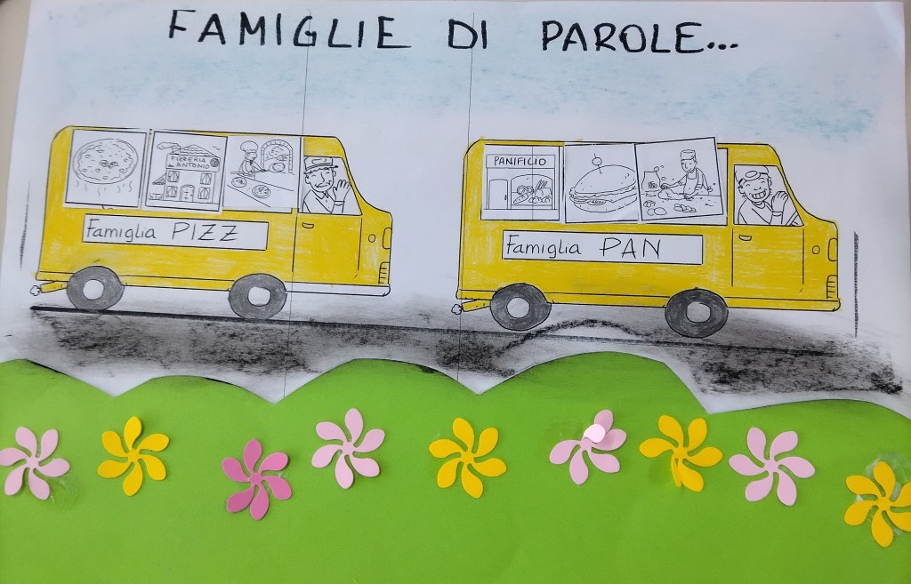 Il signor Giacomo organizza delle gite per le parole, ma sul suo pulmino ci sono pochi posti e può salire solo una famiglia alla volta. Sale la famiglia PIZZ, poi la famiglia PAN, poi la famiglia LATT ed infine la famiglia GELAT. Ho preparato delle immagini relative alle varie parole appartenenti alle famiglie sopra citate (pizzeria, pizzaiolo, pizza, panino, panettiere, panificio, latte, latteria, latticini, gelato, gelateria, gelataio), i bambini hanno in mano le immagini, saliranno solo quelli appartenenti alla famiglia nominata dal signor Giacomo.
